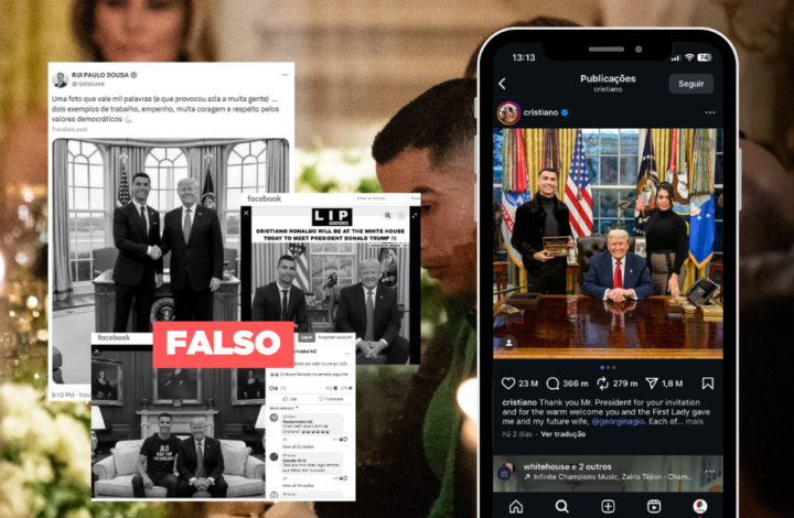 Lisboa, 20 nov 2025 (Lusa Verifica) – Cristiano Ronaldo participou esta semana num jantar com Donald Trump e foi recebido pelo presidente norte-americano no dia seguinte, mas fotos que circulam nas redes sobre o encontro na Sala Oval são falsas e foram geradas por Inteligência Artificial.